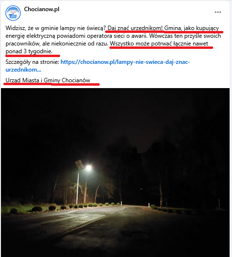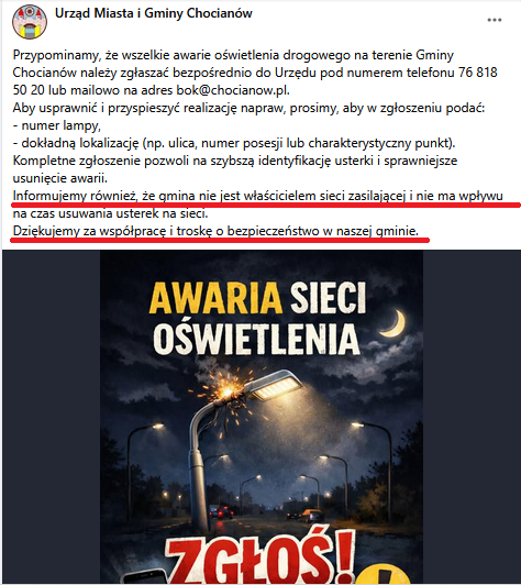 Pozwólcie, że dzisiejszy spis niefortunnych (eufemizm) wypowiedzi i zachowań chocianowskiej władzy zacznę od parodii urzędowej informacji o swoistym “oświeceniu władzy”, ups, to jest o oświetleniu ulicznym, które – jak dowiadujemy się z urzędowej informacji – nie jest własnością Gminy, za to jego awaryjność, już jak najbardziej stanowi własność mieszkańców.
