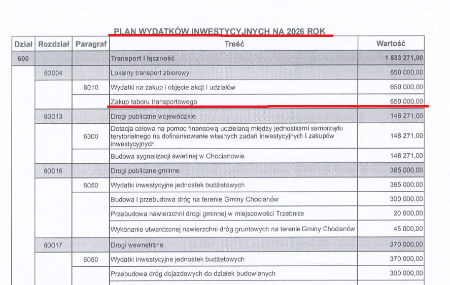 Niestety uchwała, którą ostatecznie uchwalili radni w grudniu mówiła o tym, że burmistrz środki na zakup taboru transportowego zmniejszył do 650.000,00 zł!