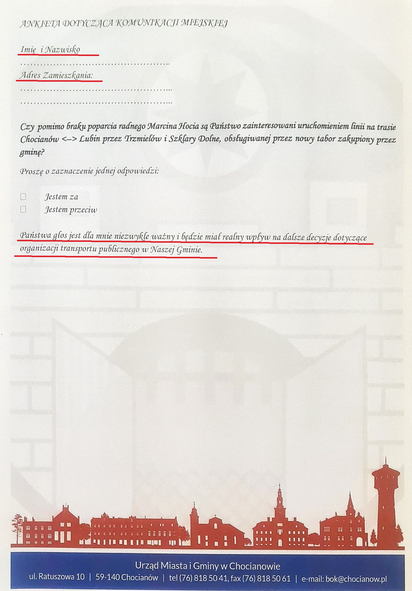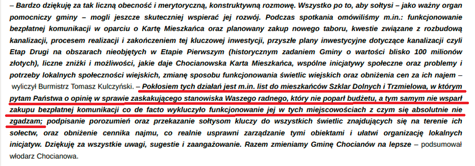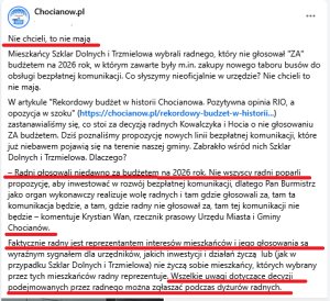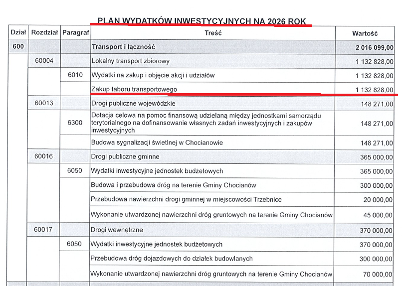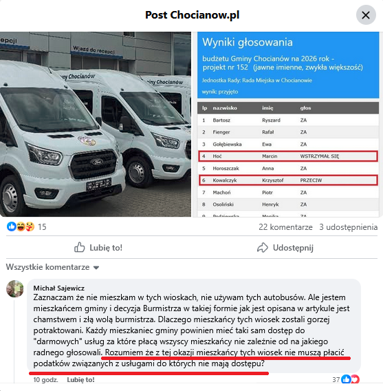 Podkreślę, że ochronę prawną w wykonywaniu demokracji lokalnej radni otrzymują w chwili zaprzysiężenia, a tego hopsztosy chocianowskiego organu wykonawczego to przekroczenie wszelkich miar infantylizmu, braku wiedzy prawnej i ewidentne demonstrowanie złej woli w stosunku do regulowania stosunków społecznych w myśl urzędniczej zasady działania zgodnie i w granicach prawa. Jeśli w procesie demokratycznego głosowania większość Rady Miejskiej uchwaliła budżet na 2026, który przy istnieniu wielu poważniejszych durnot zakłada m.in. zakup kilku busów, to sprzeciw radnego Marcina Hoć dotyczy całości uchwały, a nie tego, czy innego wydatku bądź sprzedaży papierów komunalnych. W tym miejscu jako ciekawostkę podam według mnie ważny powód, który stał u podstaw “wstrzymania się od głosu” radnego ze Szklar Dolnych podczas uchwalania budżetu i – zapewniam – burmistrzowi nie będzie już do radości. Otóż w projekcie budżetu na 2026 roku, który burmistrz 5 listopada wysłał do Regionalnej Izby Obrachunkowej i Rady Miejskiej w celu wydania opinii dokument zawierał informację, że na zakup taboru transportu przeznaczy 1.132.828,00 zł!