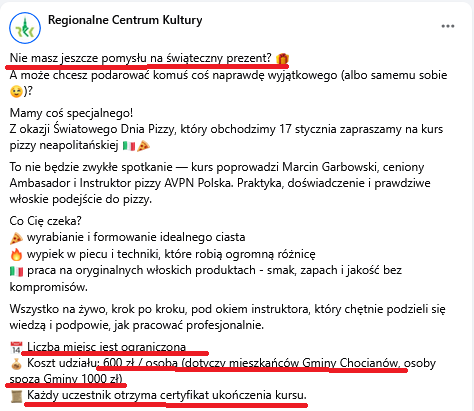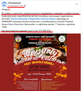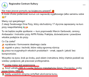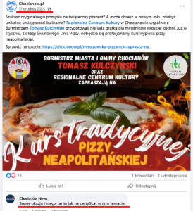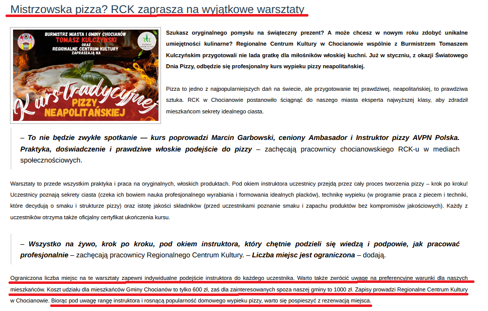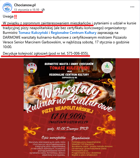 W związku z ogromnym zainteresowaniem mieszkańców i pytaniami o udział w kursie tradycyjnej pizzy neapolitańskiej (…) organizatorzy: