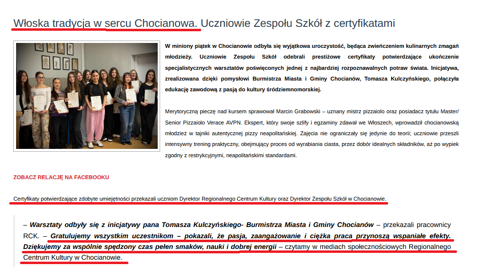 Mówiąc między nami, uważam, że burmistrz informując, że Konwent rzekomo podjął decyzję o “ankiecie” dla mieszkańców, tym razem wyłącznie medialnie wyciera się sołtysami. Jednocześnie dam sobie paznokcie wyczyścić za to, że kuriozalne “konsultacje społeczne”, z jakimi dziś mają do czynienia mieszkańcy Szklar i Trzmielowa to jego następny autorski pomysł. Zresztą, co by nie mówić, to tylko jeden z bogatej palety durnych i durniejszych pomysłów, jakimi raczony jest Chocianów. O, proszę, popatrzcie teraz na tłumaczenia chłoptaków, dlaczego warsztaty pieczenia włoskiej pizzy z płatnego eventu, który miał się odbyć w RCK, zamieniły się w prezentację pokazu pieczenia pizzy dla młodzieży szkolnej radnego Machonia juniora, za który Gmina poprzez dotację statutową RCK (pozdrawiam klasyczkę) wydała całe dziesiątki tysięcy, nie tysiąc, ani dwa…