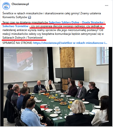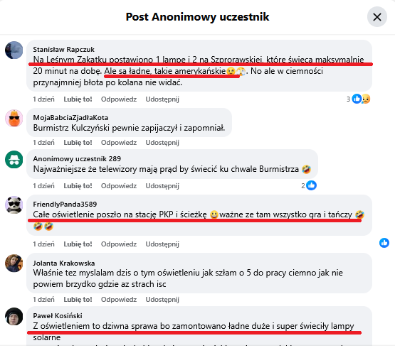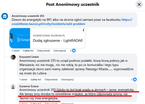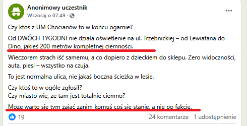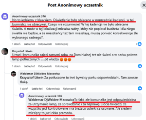 Jak widać, że nie tylko Facebookowe bohomazy odnośnie zaniedbań w realizacji zadania zapewnienia oświetlenia w Gminie to produkt eksportowy myśli chłoptaków z Lubina. Nie muszą korzystać z oświetlenia w Chocianowie, więc mogą czekać tygodniami na naprawy, bo mają swoje wielkomiejskie źródła światła i radości z widzenia spraw prowincji nieco na opak urzędniczej powinności.