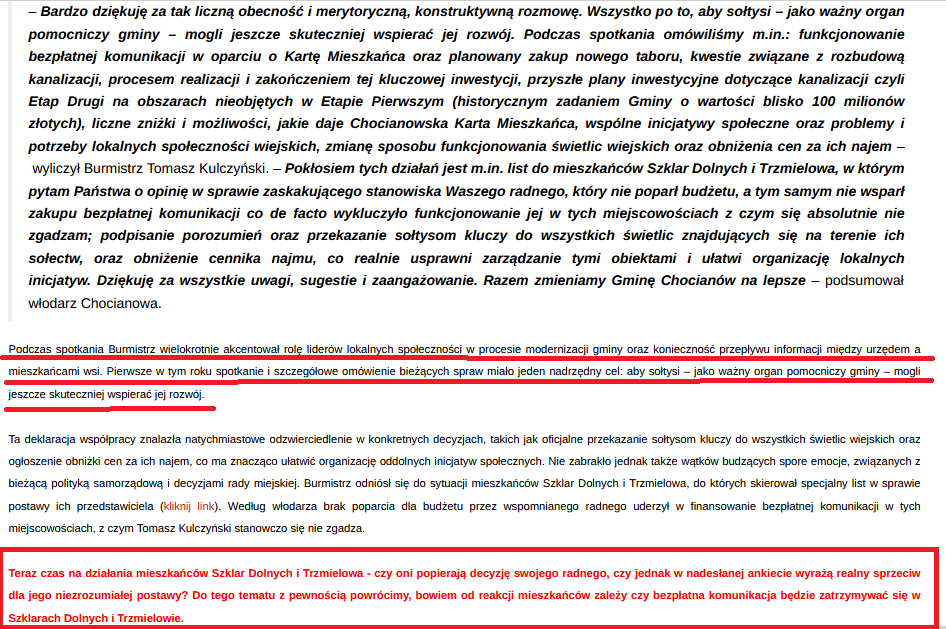 Teraz czas na działania mieszkańców Szklar Dolnych i Trzmielowa – czy oni popierają swojego radnego, czy jednak w nadesłanej ankiecie wyrażą realny sprzeciw dla jego niezrozumiałej postawy? Do tego tematu z pewnością wrócimy, bowiem od reakcji mieszkańców zależy czy bezpłatna komunikacja będzie zatrzymywać się w Szklarach Dolnych i Trzmielowie