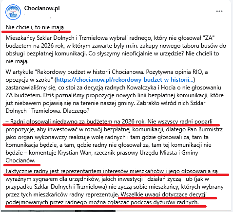 Bez urazy, ale ten bełkot, jak to bełkot opiera się przede wszystkim na antytezie do rozumu, próbując wmówić czytelnikom, że “Państwa reprezentant w Radzie Miejskiej postanowił, że nie są Państwo zainteresowani gminną komunikacją”. Poza tym wyraźnie widać, że burmistrz nie wie, że nie jest przełożonym radnego, a Rada Miejska nie jest organem podporządkowanym władzy wykonawczej. Każda próba wywierania nacisku na radnego jest bezprawną ingerencją w swobodę wykonywania mandatu. Personalne ataki, publiczne stygmatyzowanie oraz obarczanie radnego odpowiedzialnością za decyzje podejmowane w demokratycznych głosowaniach Rady Miejskiej — w szczególności nad projektem budżetu na 2026 rok — stanowi rażące przekroczenie uprawnień przez funkcjonariusza publicznego.